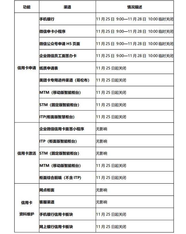 信用卡相關(guān)業(yè)務(wù)辦理渠道變更公告 日期:2022-11-24 15:09:10 尊敬的客戶: 為給您提供更優(yōu)質(zhì)的服務(wù),我行將于2022年11月25日起調(diào)整信用卡申請、激活、信息維護(hù)的相關(guān)渠道,變更內(nèi)容詳見下表: 給您造成不便,敬請諒解。如有疑問,歡迎咨詢24小時客服熱線400-858-8888。感謝您對廈門銀行信用卡的支持! 特此公告! 廈門銀行股份有限公司 2022年11月24日 上一篇 返回 下一篇